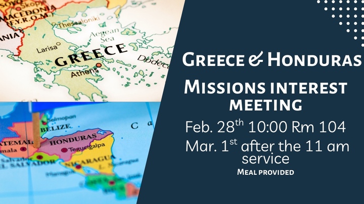 Come meet Jimmy, our Athens, Greece Mission Partner and learn about two exciting Mission Trip Opportunities. Honduras – June 7 – 13, 2026 Athens, Greece – October 16-25, 2026 Brunch/Lunch will be provided. When: 2/28/26 – 10:00 & 3/1/26 after 3rd service Where: Rm 104 We’d love to see you there!