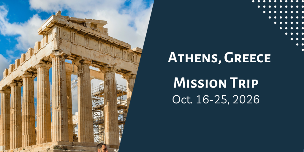 Join us on an upcoming mission trip to Athens, Greece, where we will partner with Jimmy and Davi Paris, the only IMB missionaries currently working directly with the native Greek population. Our team will serve alongside them by engaging with a new community center, building relationships through street conversations, community mapping, and prayer walking throughout the area.